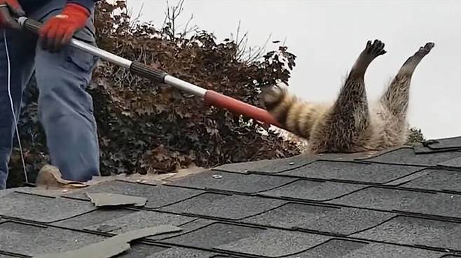 캐나다 온타리오에 있는 한 가정집입니다. 너구리 한 마리가 지붕에 거꾸로 박힌 채 발버둥 치고 있습니다.