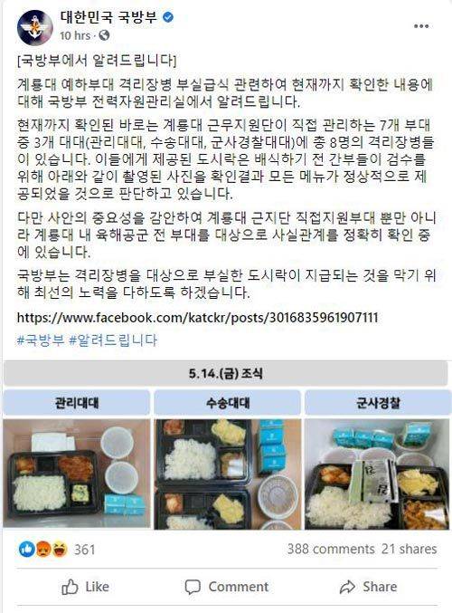 국방부 페이스북에 따르면 국방부 전력자원관리실은 어제(16일) 오후 늦게 '국방부에서 알려드립니다' 제목의 입장과 함께 국방부 직할부대인 계룡대근무지원단이 관리하는 대대 소속 격리 장병들에게 제공된 급식 사진 3장을 게시했습니다.