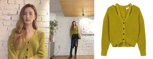 컬러 아이템으로 포인트를 준 나나의 인스타그램 속 가디건은 산뜻한 라임컬러와 어깨 트임 디테일로 캐주얼하면서도 여리여리한 청순함까지 자랑할 수 있는 디자인으로, 나나는 ‘오! 주인님’ 14회에 레더 스커트와 함께 매치하여 걸크러쉬한 매력을 선보였다. 나나의 매력을 보여준 가디건은 해리스 미국 부통령의 의붓딸 엘라 엠호프가 모델로 데뷔했던 브랜드 ‘프로엔자 스쿨러’의 제품.