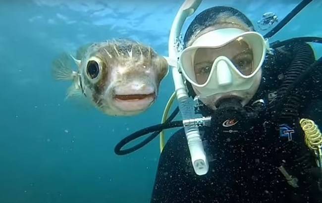 잠수부의 얼굴 옆으로 다가와 마치 '셀카'를 찍는 듯한 귀여운 복어 사진과 동영상이 공개되어 웃음을 주고 있다.