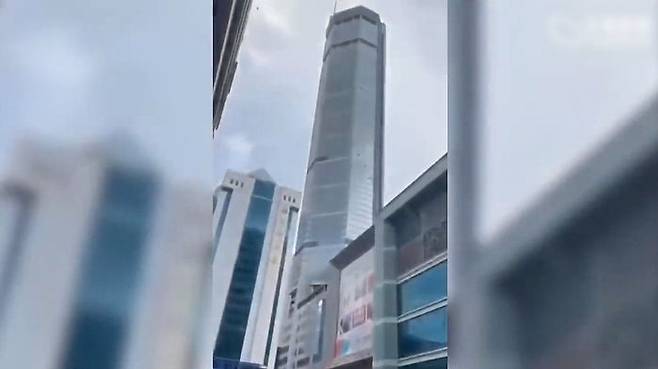 SNS에 공개된 현장 영상을 보면 빌딩 옥상에 있는 두 개의 기둥 모양 구조물이 좌우로 크게 흔들립니다.