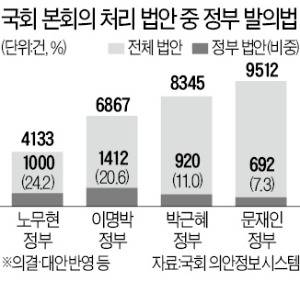 19일 국회 의안정보시스템에 따르면 2017년 5월 10일 문재인 대통령 취임 후 이날까지 4년여 동안 국회를 통과해 실제 법률에 반영(의결·대안 반영)된 법안은 총 9512건이다. 이 중 정부가 발의한 법안은 692건으로 7.3%에 불과했다. 나머지 8820건의 법안은 모두 국회의원과 국회 상임위원장이 발의한 법안이다. 역대 정부 중 반영 법안 건수가 가장 많았지만 정부 법안 비중은 가장 낮았다.