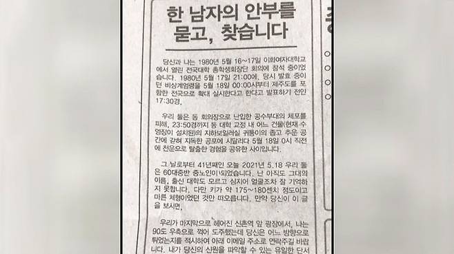 이 신문 광고는 41년 전인 1980년 5월 18일, 비상계엄령이 전국적으로 확대되기 직전 공수부대 체포를 피해서 함께 대학 교정 내 지하 보일러실에서 몸을 숨겼던 남성을 찾는다는 내용입니다.