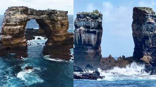 현지 시간으로 17일, 에콰도르 환경부가 트위터에 공개한 사진을 보면 바위 가운데 부분이 주저앉으면서 이렇게 돌기둥 2개만 덩그러니 남았습니다.