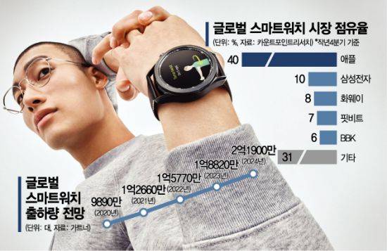 하드웨어 강자 삼성전자와 앱 생태계 강자 구글의 이번 협력은 스마트워치 등 웨어러블시장에서 애플을 넘어서기 위한 행보다. 시장조사업체 카운터포인트리서치에 따르면 지난해 4분기 기준으로 한 애플의 글로벌 스마트워치 점유율은 무려 40%(1위)다. 2위인 삼성전자(10%)의 4배에 달한다. 2019년 말 구글이 인수한 핏비트(7%, 4위)의 점유율과 합쳐도 애플의 절반에 못 미친다. ‘손목 위 주치의’로 불리는 스마트워치시장 주도권을 사실상 애플에 빼앗긴 셈이다.