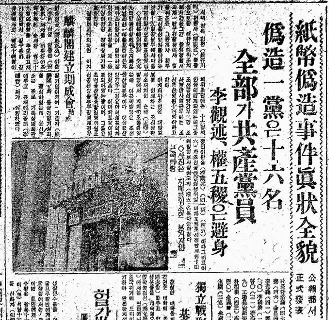 | ▲ 정판사 '위폐' 사건이란 "조선정판사(朝鮮精版社)"라는 한 인쇄소에서 조선공산당 간부들과 조선공산당 당원인 조선정판사 직원들이 위조지폐를 찍어내 조선공산당의 자금으로 사용했다고 미군정이 발표하여 유죄 판결을 내린 사건이다. |