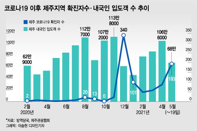 지난해 2월 코로나19 발생 이후 약 16개월 간 제주 내국인 입도객이 100만명을 넘은 것은 4번이다. 여름 성수기였던 8월(113만)과 사회적 거리두기가 다소 완화됐던 지난해 10월(107만)과 11월(114만), 그리고 지난달인데 이후 확진자가 급증했다. 10월 확진자가 '제로(0)'였던 제주는 11월과 12월에만 362명이 확진됐고, 1월에도 101명이 확진됐다. 지난달에도 확진자가 87명을 기록하더니 이달 들어선 벌써 190명을 돌파했다.