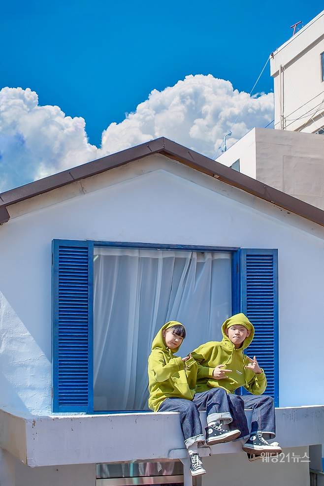 좁은 골목길 속에 눈길을 끄는 파란 창문의 하얀 건물이 요즘 부산 여행 포스팅마다 보이는 바로 그 '포카리 감성' 사진을 찍어주는 파란만장사진관이다.