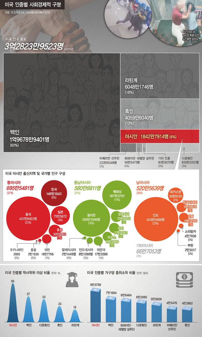 미 인구조사국이 지난해 6월 발표한 ‘2019년 센서스’를 보면, 미국 인구 3억2823명 중 백인이 60.1%, 히스패닉 18.5%, 흑인 13.4%, 아시안이 5.9%를 차지한다. 미 통계청이 발표한 2019년 자료를 보면, 아시아인 가구의 중위소득은 9만3759달러로, 7만1664달러인 백인보다 높고(일하는 세대원이 많기 때문), 흑인이나 라틴계에 비해서는 거의 두배나 많다. 아시아인 중 대학 졸업 이상 비율은 56%에 이르는데, 흑인(23%), 라틴계(18%)보다 높은 것은 물론 백인(37%)보다도 높다.