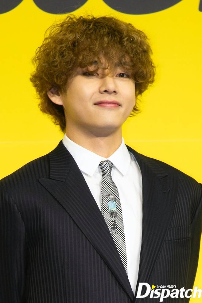 그룹 '방탄소년단(BTS)' 뷔가 21일 오후 서울 송파구 방이동 올림픽공원 올림픽홀에서 열린 새 디지털 싱글 'Butter' 발매 기념 글로벌 기자간담회에서 포즈를 취하고 있다.
