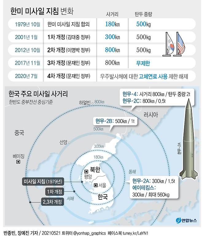 그러나 북한 핵·미사일 위협이 점증함에 따라 미사일지침에 따른 제한은 단계적으로 완화됐다. 김대중 정부 시절인 2001년 1월 한국이 최대 사거리 300㎞, 탄두 중량 500㎏인 미사일을 개발·보유할 수 있게 지침이 1차 개정됐다. 이어 이명박 정부 시절인 2012년 10월 탄도미사일의 최대 사거리를 800㎞로 늘리는 2차 개정이 이뤄졌다. 문재인 정부 들어서는 두 차례 개정됐다. 2017년 11월 탄도미사일의 사거리를 800㎞로 하되 탄두 중량 제한을 완전히 없애는 내용의 3차 개정이 이뤄졌고, 지난해 7월에는 4차 개정을 통해 우주발사체에 대한 고체연료 사용 제한을 해제했다.