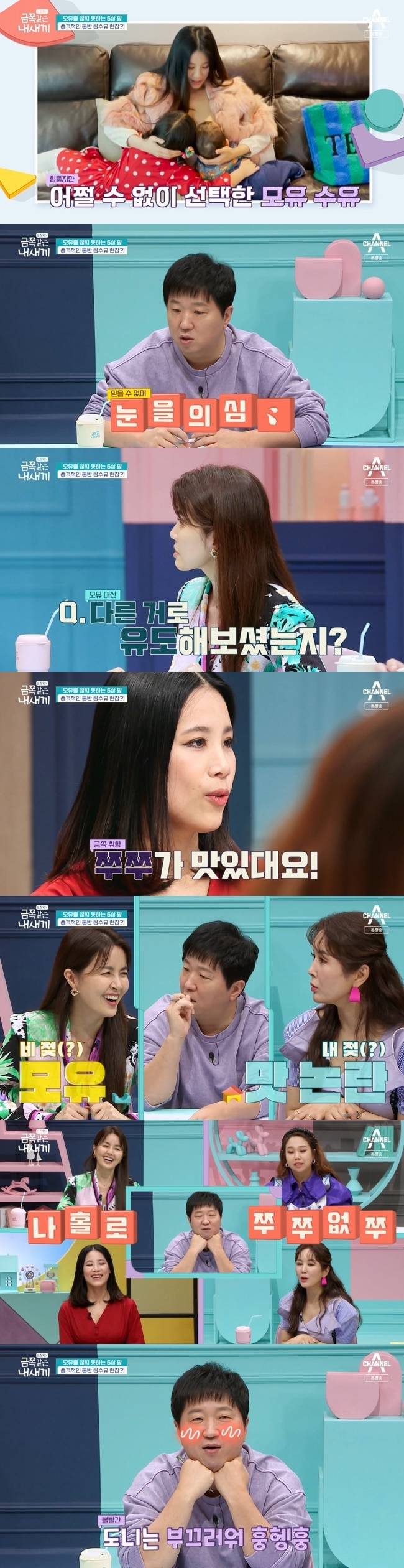 반면 금쪽이 엄마는 “저도 먹어봤는데 달콤하더라. 의외로 달다”고 답했다. 이에 장영란은 “내 젖은 안 그렇던데”라고 말했다. 대화에 끼지 못한 정형된은 계속 되는 모유 토크에 “너무 여기저기서”라고 난감해하며 웃음을 자아냈다. (사진=채널A '요즘 육아-금쪽같은 내새끼' 방송 캡처)