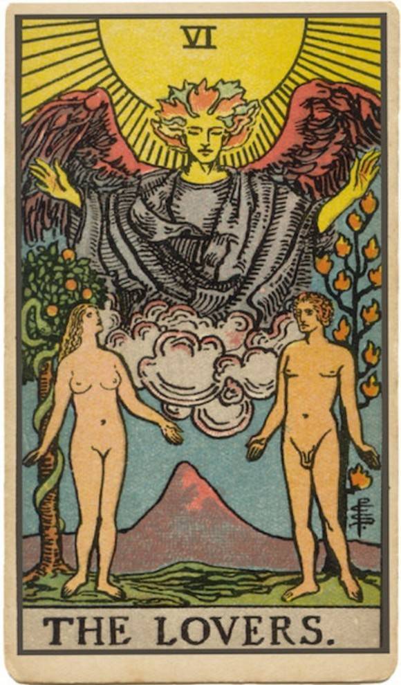 그러나 인간의 사랑은 수직이 아니라 수평이라고 이 카드가 말하고 있는 듯하다. 이브는 45도 각도로 허공을 쳐다보고 아담은 그런 이브를 응시하고 있다. 이처럼 사랑은 한 방향을 보지 않아도 된다고 말하고 있는 듯하다. 생각이 달라도 사고방식과 행동이 달라도 서로 수평으로 연결될 수 있는 것이 바로 사랑이라고 말해주는 듯하다.