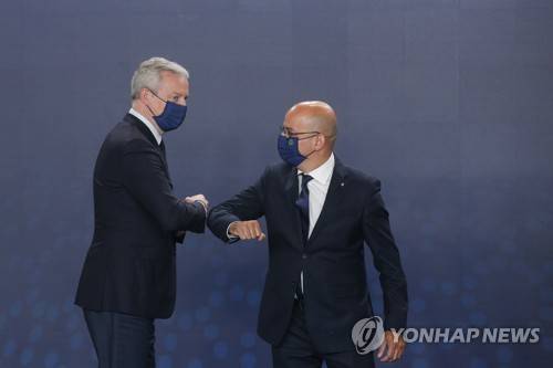 epa09219192 Portuguese State Minister for Finance Joao Leao (R) welcomes French Minister for the Economy, Finance and the Recovery, Bruno le Maire (L), on the second day of the informal meeting of Economic and Financial Affairs Council (ECOFIN) under the Portuguese Presidency of the Council, in Lisbon, Portugal, 22 May 2021. The talks take place against the backdrop of the common policies for the post-crisis period and for a green and inclusive future. Reinforcing the joint impact of monetary and fiscal policies. EPA/MARIO CRUZ