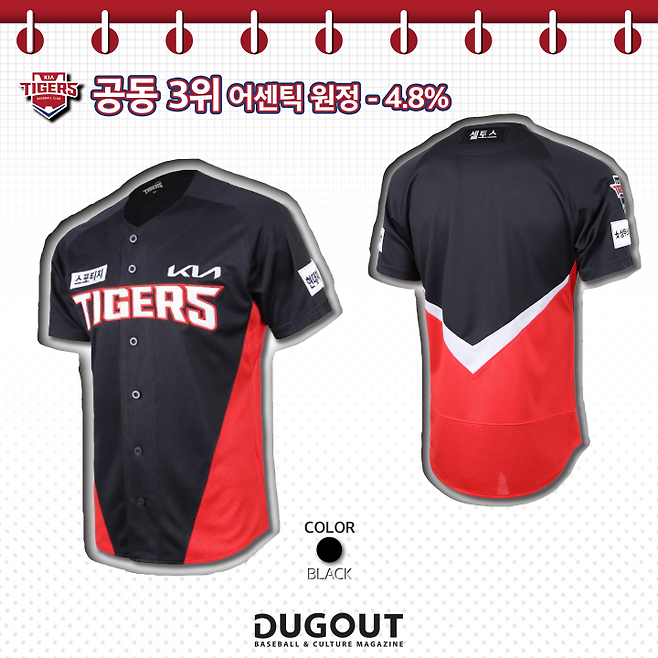 검은색과 빨간색 그리고 호랑이. KIA의 상징을 꼽으라면 누구나 이 세 가지를 가장 먼저 떠올릴 것이다. KIA의 오랜 역사 속 대부분의 역대 유니폼에는 이 세 가지가 담겼다. 빨간색과 검은색은 야구를 보는 팬에게 강렬한 이미지를 줬고 이에 걸맞게 선수들도 실제로 강한 경기력을 선보이며 탄탄한 팬층을 만들었다. 선동열, 이종범 등 KIA의 레전드들이 소위 ‘검빨(검은색과 빨간색의 조합) 유니폼’을 입고 한국시리즈에서 대활약하는 모습은 KIA 팬은 물론이고 타 팀 팬에게도 깊은 인상을 남겼다. 검은색과 빨간색은 KIA의 색이라고 해도 과언이 아니다.