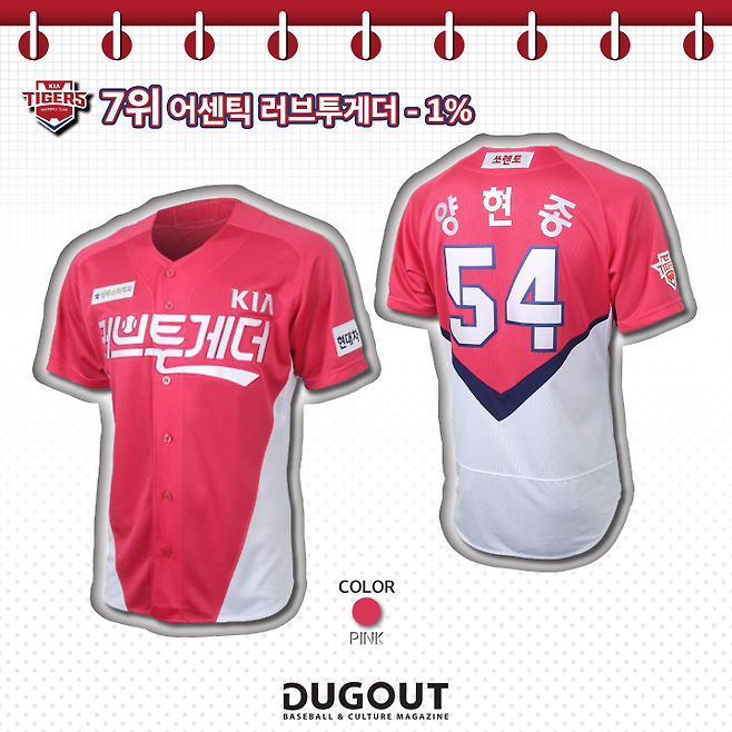 비록 이번 선호도 조사에서는 최하위를 차지했지만 좋은 의미를 담은 유니폼이다. 모티브가 된 KIA의 러브투게더 캠페인은 KIA와 모기업 기아자동차가 매년 두세 차례 진행하는 사회 환원 캠페인이다. 2010년부터 KIA의 경기 기록에 따라 선수단과 구단, 기아자동차 임직원들이 자발적으로 매월 기부금을 적립해 시즌 종료 후 적립 금액으로 다양한 사회공헌 활동을 진행한다. 초기엔 ‘Love Together’와 같이 영어로 표기했지만 2019년부터는 한글로 표기했다. 이어 2020시즌에는 핫핑크 컬러로 출시됐다. KIA 황대인은 이 유니폼을 입고 설현 포즈를 취한 게 중계를 타 ‘황설현’이라는 별명을 얻기도 했다. 좋은 의미가 담긴 유니폼인 만큼 러브투게더 캠페인 홍보에 더욱 널리 활용돼 팬의 지속적인 관심을 유도하길 바란다.