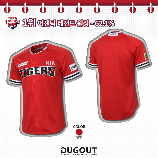 검빨 유니폼이 이미 KIA 팬에게 워낙 강력하게 각인된 상황이라 전혀 다른 디자인의 홈·원정 유니폼이나 얼터네이트 유니폼(Alternate Uniform)이 출시되더라도 결국은 검빨 유니폼을 찾게 된다는 게 팬 사이의 정설이다. 이번 선호도 조사에서 KIA의 대표적 검빨 유니폼인 ‘레전드 유니폼’이 60%가 넘는 압도적인 선호도를 보인 게 그 증거다. KIA는 레이디스 데이, 러브투게더 캠페인 데이, 8.15 광복절 등 특별한 날에 입는 유니폼과 디즈니, 마블 등과 컬래버레이션을 진행한 유니폼을 출시하며 패션 아이템으로서의 유니폼 다양화에 힘써왔다. KBO리그 구단별로 각 연고지 명칭을 새긴 유니폼 바람이 불면서 KIA도 연고지인 광주를 담은 ‘GWANGJU 유니폼’을 선보였다. 다양한 유니폼 중 선정된 2021시즌 홈·원정 유니폼, 레전드 원정 유니폼, 8.15 광복절 유니폼, GWANGJU 유니폼, 러브투게더 유니폼, 핑크 유니폼의 순위는 아래와 같다.