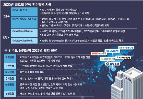 국내 은행들도 세계를 상대로 바쁘게 움직였다. 인구 감소와 저성장, 역사적 초저금리까지 겹쳤다. 사모펀드 판매로 인한 후폭풍과 빅테크의 도전 속에 코로나19로 지난해 시중은행들 순이익이 1년 전보다 11.5% 감소한 12조3000억원에 그쳤다. 국내 시장에서 땅 따먹기 수준의 경쟁만 하기보다 전염병으로 인한 불확실성 속에서도 미래의 먹거리를 발굴하기 위해 나섰다.