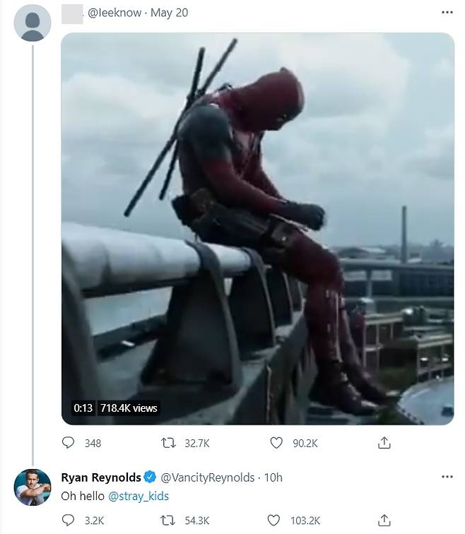 이 가운데 라이언 레이놀즈가 자신의 SNS 계정에 "안녕, 스트레이 키즈(Oh hello Stray kids)"라는 트윗을 남기며 스트레이 키즈의 공식 SNS 계정을 해시태그로 걸어 폭발적인 반응을 일으켰다. 한 팬이 영화 '데드풀'의 한 장면과 스트레이 키즈의 무대 영상을 교차편집하여 게시한 영상에 라이언 레이놀즈가 직접 반응을 보인 것.