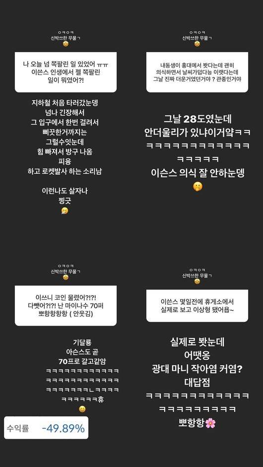하지만 수많은 질문들 중 누리꾼들의 시선을 단번에 사로잡은 건 따로 있었다. 바로 요즘 대한민국 국민들의 최대 관심사인 코인이었던 것. 제이쓴은 "코인 물렸어? 다 뺐어? 난 마이너스 70퍼센트. 뽀항항항항 (안웃김)"이라는 한 팬의 말에 "기다려. 이슨스도 곧 70퍼센트 갈 거 같아"라며 현재 -49.89%인 자신의 코인 수익률 사진을 업로드했다.