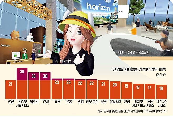 올 1월 네이버에 입사한 신입사원은 첫 출근을 코로나19 때문에 재택근무로 시작했다. 하지만 네이버 사옥을 둘러보고 동기들끼리 ‘인증샷’을 찍고 회식도 했다. 네이버의 메타버스 플랫폼 ‘제페토’가 무대였다. 사원들은 각자 아바타를 만들어 팀별 미션을 수행하고 가상세계에 조성된 네이버 사옥투어도 했다. 네이버뿐만 아니다. 많은 국내외 기업이 업무, 회의, 포럼, 직원교육에 활용하고 있다.