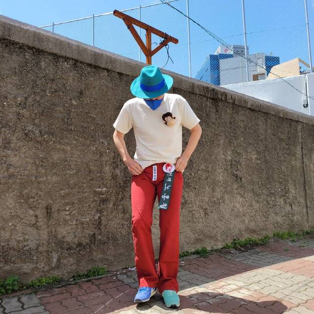 공개된 사진 속 노홍철은 파란색 페도라와 붉은색 바지 그리고 짝짝이 신발까지 언발란스 한 패션 조합을 선보였다.