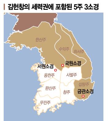 김헌창은 9주 5소경 가운데 5주 3소경을 차지했다. 웅천주, 완산주(전주), 무진주(광주), 사벌주(상주), 청주(진주), 국원소경(충주), 서원소경(청주), 금관소경(김해)이 반란에 가담한 것이다. 김헌창은 옛 백제 지역을 중심으로 신라 영토의 절반을 세력권으로 뒀다. 이로써 신라는 북방의 한산주, 우두주, 명주와 단절되고 경주를 중심으로 하는 일부 지역과 주변이 모두 반란군에 포위되고 말았다.
