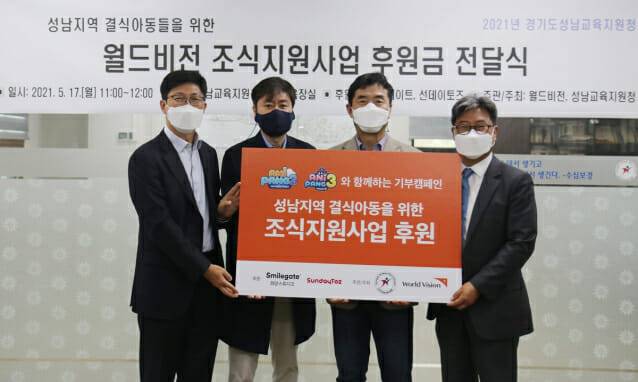 스마일게이트 희망스튜디오(이사장 권혁빈, 희망스튜디오)는 선데이토즈(대표 김정섭)와 사회복지법인 월드비전(회장 조명환)과 함께 성남지역 결식아동의 아침을 지원하기 위한 기부금을 성남시 교육청에 전달했다고 26일(수) 밝혔다.