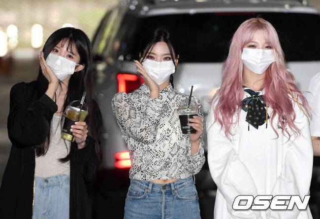 그룹 프로미스나인 송하영, 이새롬, 백지헌이 취재진을 향해 포즈를 취하고 있다. /sunday@osen.co.kr