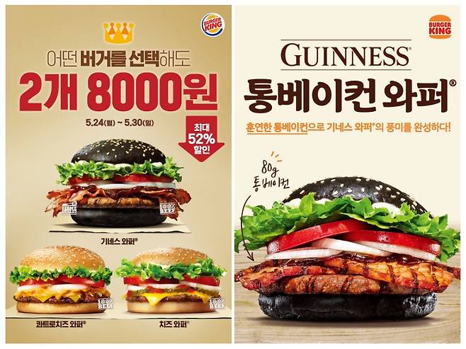 한편, 프리미엄 햄버거 브랜드 버거킹이 5월 30일(일)까지 프리미엄 와퍼 메뉴 2개를 8,000원에 구매할 수 있는 프로모션을 진행한다. 해당 프로모션이 적용되는 메뉴는 ‘기네스와퍼’, ‘콰트로치즈와퍼’, ‘치즈와퍼’ 3종으로, 선택하는 메뉴에 따라 최대 52% 할인 혜택을 누릴 수 있다.