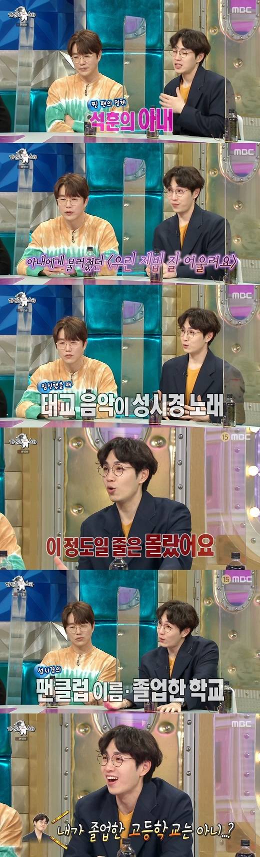 "아내가 시경이 형의 찐팬이다"라고 말문을 연 이석훈은 "알고보니 저희의 첫 만남에 시경이 형의 노래가 있었고 처음 불러준 노래가 '우린 제법 잘 어울려요'였다. 뱃속에 아기가 있을 때도 시경이 형 노래를 많이 들었다더라. 시경이 형의 팬클럽 이름, 졸업한 중학교, 고등학교까지 다 알더라"라며 쓴웃음을 지었다.