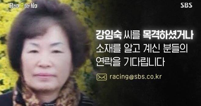 '당신이 혹하는 사이'는 시즌1을 마무리 하며 '강임숙 씨를 목격하셨거나 소재를 알고 계신 분들의 연락을 기다립니다'는 문구를 띄워 제보를 받았다. (사진=SBS '당신이 혹하는 사이' 캡처)