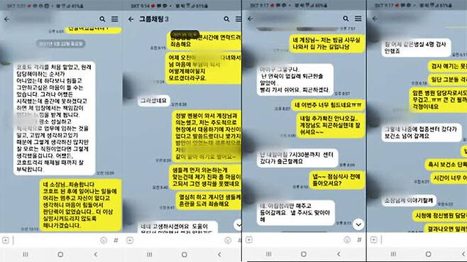 동료와 상사에게 정신적 압박감을 토로하고 한편으로는 죄송하고 실망시키지 않겠다며 스스로를 자책하는 문자를 보냈습니다.