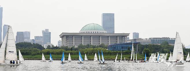 23일 오전 서울 당산철교와 서강대교 한강변 일대에서 ‘2021 서울시회장배 요트대회’ 가 열리고 있다. 황진환 기자