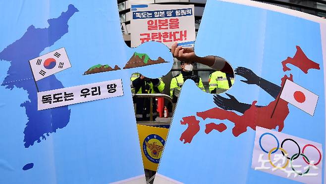 국민주권연대 관계자들이 27일 오후 서울 종로구 주한일본대사관 앞에서 ‘독도는 일본땅’ 올림픽, 일본규탄 기자회견을 갖고 있다. 황진환 기자