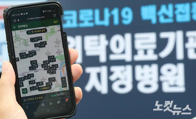 네이버와 카카오 앱을 통한 코로나19 잔여 백신 조회와 당일 접종 예약이 가능해진 27일 오후 서울 양천구 홍익병원에서 한 시민이 네이버 앱을 이용해 예약을 시도하고 있다. 황진환 기자