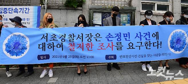 반포한강사건 진실을 찾는 사람들(반진사) 회원들이 25일 오전 서울 서초경찰서 앞에서 ‘고 손정민 사건 철저한 조사 요구’ 기자회견을 갖고 있다. 황진환 기자