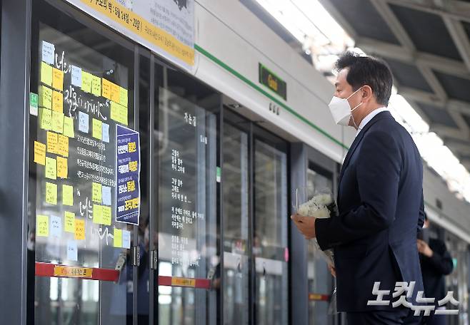 오세훈 서울시장이 27일 서울 광진구 구의역 내선 순환 9-4 승강장 스크린 벽 앞에서 '구의역 참사' 5주기를 하루 앞두고 희생된 김군을 추모하고 있다. 이한형 기자
