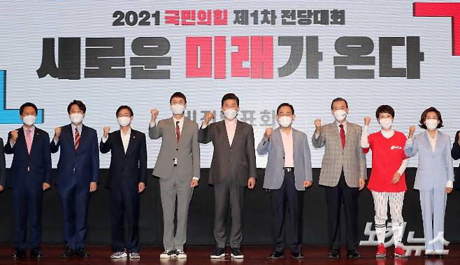 국민의힘 당 대표 후보들이 25일 오전 서울 마포구 누리꿈스퀘어 국제회의장에서 열린 제1차 전당대회 후보자 비전발표회에 앞서 기념촬영을 하고 있다. 사진은 왼쪽부터 김기현 당 대표 권한대행, 이준석, 조경태, 김웅, 윤영석, 주호영, 홍문표, 김은혜, 나경원 후보. 윤창원 기자