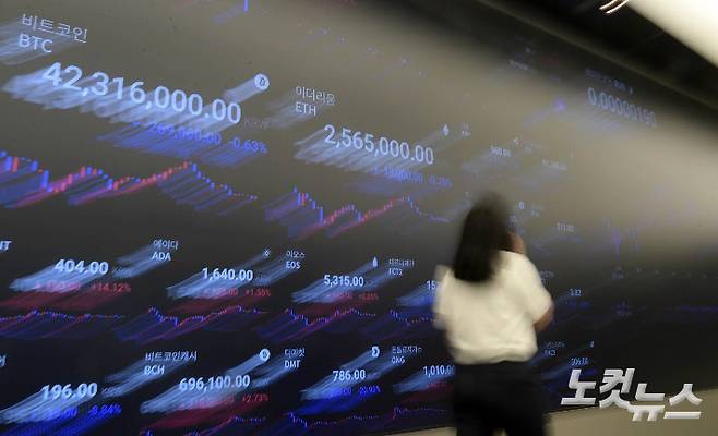 24일 오후 서울 강남구 암호화폐 거래소 업비트 라운지 현황판에 급락하고 있는 비트코인 가격이 보이고 있다. 이한형 기자