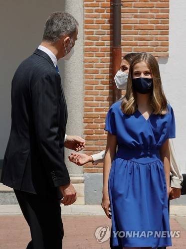 epa09233036 King Felipe VI (L), Queen Letizia (R-back) and Princess Leonor (R-front) leave the Asuncion de Nuestra Senora parish church after the ceremony where Leonor received the sacrament of confirmation at Aravaca district of Madrid, central Spain, 28 May 2021. Princess Leonor made her confirmation with her classmates in Aravaca, the same district in Madrid where the private school Santa Maria de los Rosales is located, in which she has attended primary and secondary school. EPA/Ballesteros