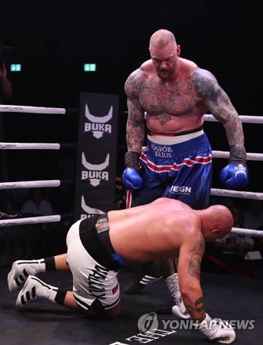 epa09233975 Hafthor Bjornsson (up) of Iceland in action against former Commonwealth Games gold medallist Simon Vallily of Britain during their exhibition boxing match in the Gulf Emirate of Dubai, United Arab Emirates, 28 May 2021 EPA/ALI HAIDER