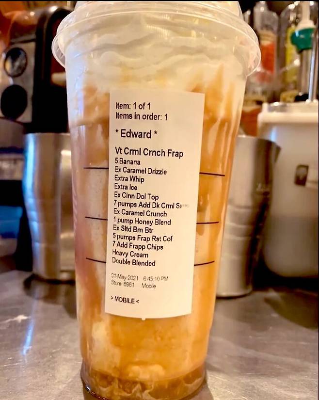 사진 속 음료에는 깨알 같은 글씨로바나나 조각 5개, 캐러멜 드리즐 추가, 휘핑크림 추가, 얼음 추가, 시나몬 돌체 토핑 추가, 캐러멜 크런치 추가 등 13가지 요구사항이 적혔습니다.