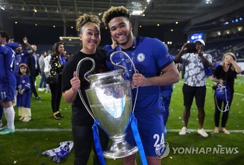 epa09236263 Reece James of Chelsea and his sister Lauren James poses with the trophy after Chelsea won the UEFA Champions League final between Manchester City and Chelsea FC in Porto, Portugal, 29 May 2021. EPA/Manu Fernandez / POOL / POOL