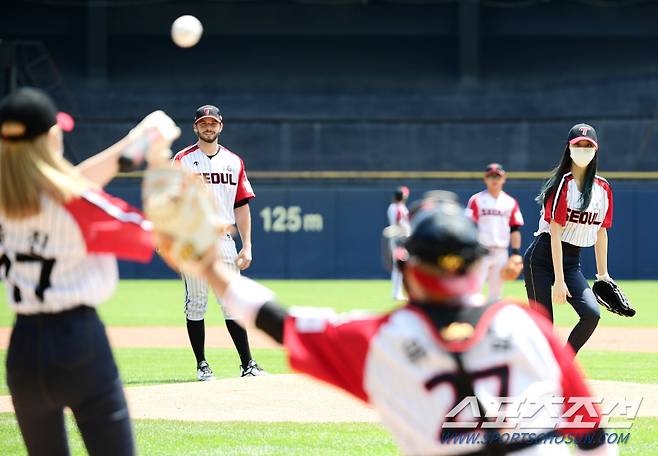 30일 서울 잠실구장, 키움과 LG 경기. 걸그룹 있지의 유나가 시구를, 류진이 시타를 했다. 유나의 몸쪽 공에 류진이 베트를 휘두르고 있다. 잠실=정재근 기자 cjg@sportschosun.com/2021.5.30/