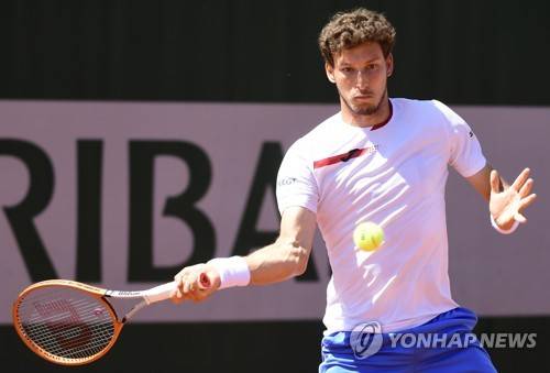 epa09236603 Pablo Carreno Busta of Spain in action against Norbert Gombos of Slovakia during their first round match at the French Open tennis tournament at Roland ?Garros in Paris, France, 30 May 2021. EPA/CAROLINE BLUMBERG