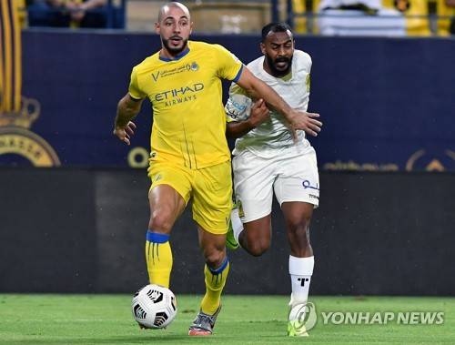 epa09237868 Al-Nassr's player Nordin Amrabat (L) in action against Al-Ittihad's Hamdan Al-Shamrani (R) during the Saudi Professional League soccer match between Al-Nassr and Al-Ittihad ?at ?Mrsool Park Stadium, in Riyadh, Saudi Arabia, 30 May 2021. EPA/STRINGER