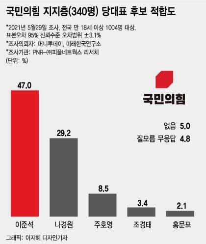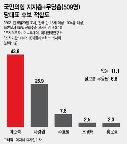 이 전 최고위원은 2위인 나 전 의원 지지율의 2배 이상을 기록했다. 국민의힘 예비경선에서 실시한 일반국민 여론조사 득표율(이준석 51%, 나경원 26%)과 비슷한 양상이다.