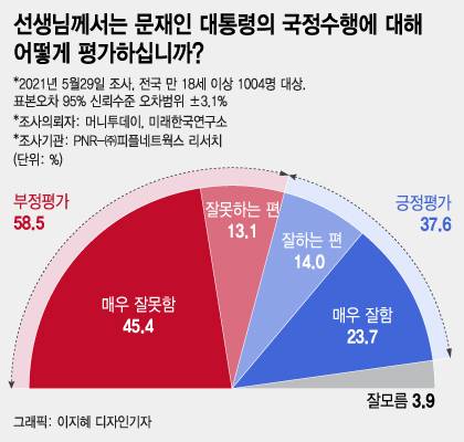 문재인 대통령 국정수행 평가 조사에선 긍정평가 37.6%(잘하는 편 14%, 매우 잘함 23.7%), 부정평가 58.5%(잘못하는 편 13.1%, 매우 잘못함 45.4%)로 나타났다. 지역별 평가를 보면 △서울: 긍정 32.6%, 부정 63.8% △경기·인천: 36.1%, 60.9% △대전·세종·충청: 34.7%, 58.7% △광주·전라: 67.6%, 29.8% △대구·경북: 28.4%, 65.7% △부산·울산·경남: 32.8%, 63.4% △강원·제주: 48.2%, 48.5%다.