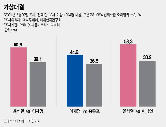 31일 머니투데이와 미래한국연구소가 여론조사업체 PNR리서치에 의뢰해 29일 하루 동안 전국의 유권자 1004명을 대상으로 조사한 결과 이같이 나타났다. 차기 대선후보 적합도 조사 결과는 윤 전 총장이 36%, 이 지사가 25.9%, 이 전 대표가 14.3%를 기록했다. 이어 홍준표 무소속 의원 5.7%, 안철수 국민의당 대표 3.3%, 정세균 전 국무총리 3.3%, 심상정 정의당 의원 1.6% 등의 순이다.